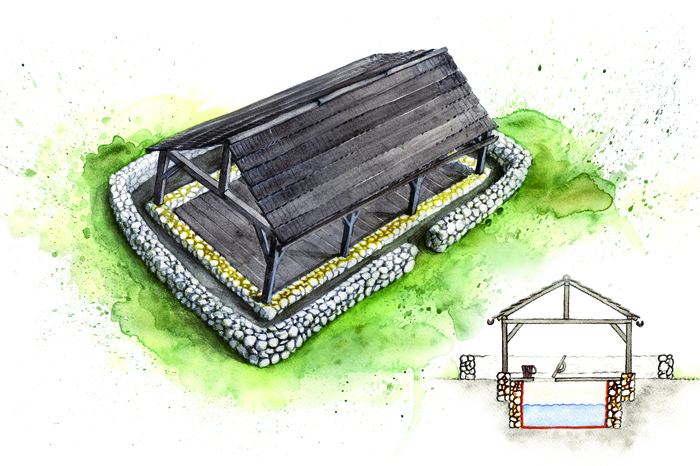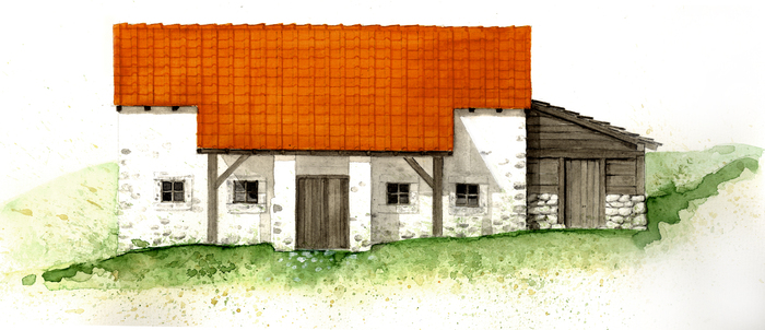 Poleg cerkva so bili izkopani še trije drugi bivalni objekti. Velika hiša ob vhodu v naselbino je zaradi ugodne lege in bogatih najdb sodila med pomembnejše objekte. Bila je pravokotnega tlorisa, na vhodu v hišo je bil zgrajen vetrolov, pred njo pa je bil z nadstreškom pokrit prostor, kjer je potekala večina hišnih opravil. Na zahodu je bil na hišo prizidan še manjši prostor, ki je imel verjetno gospodarsko funkcijo. Ostanki hiše so danes vidni v tlorisu. Naselbina se je z vodo oskrbovala iz vodnih cistern. Ena od njih, izkopana na vzhodnem platoju naselbine, je bila pravokotnega tlorisa z dvojnimi zidovi, prekrita z leseno streho. Notranja stran je bila premazana z rdečkastim vodoodpornim ometom, ki je bil še zelo dobro ohranjen.