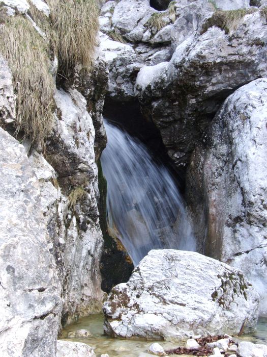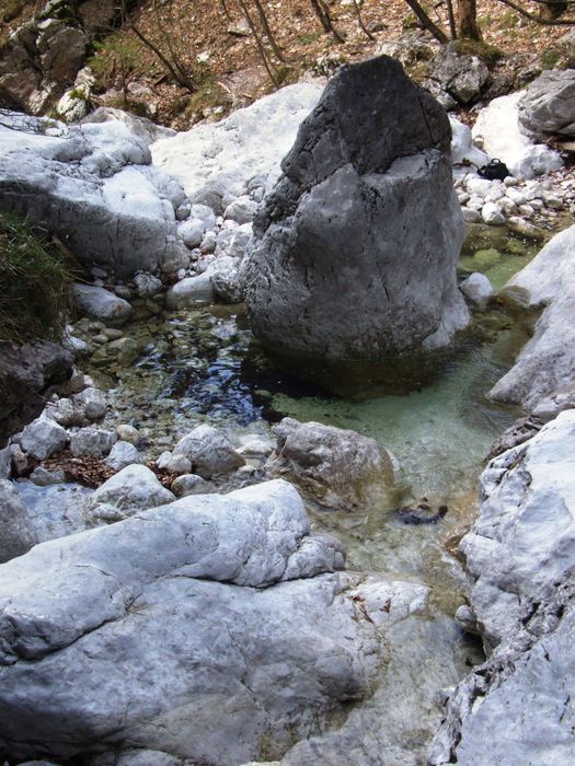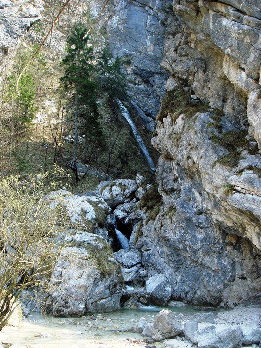 Pod glavnim slapom je še več slapičev, vmesnih tolmunov in zagozdenih apnenčastih skal. V strmi grapi se na kratko razdaljo izmenjujejo še skalne ponvice, lonci ali draslje in banjaste kotanje. Če gremo ob strugi navzdol, lahko opazimo, kako se količina vode postopoma zmanjšuje, čez nekaj sto metrov pa naletimo na končni tolmunček, pod katerim je običajno le še suha struga. Povsem drugače je ob hudih neurjih, ko velika količina padavinske vode odteka površinsko. Takrat se ne poveča le vodnatost Orglic, pač pa z njihove leve strani po sicer običajno suhi hudourniški strugi prihrumi velika množina vode, ki vali in prenaša tudi velike skale. Te najdemo po celotni strugi Kamniške Bele v istoimenski dolini.