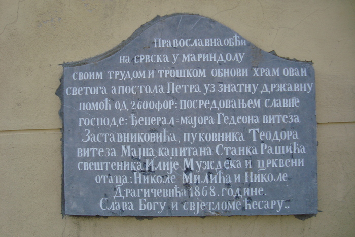 Cerkev sv. Petra in Pavla, ki je obdana z lipami, se nahaja na razglednem griču v zahodnem delu vasi, in sicer na nadmorski višini 274 metrov, od tam pa se razprostira pogled na sosednjo Hrvaško. Dostop je urejen po asfaltirani cesti, kjer se vas zaključi s pokopališčem. Cerkev je preprosta enoladijska z elementi iz obdobja neoromantizma. Streha je večdelna, njen osrednji del je somerna dvokapnica, sleme pa je orientirano v smeri severozahod-jugovzhod. Na severozahodni strani se nahaja zvonik, nad vhodnimi vrati je freska apostolov Petra in Pavla s cerkvijo v ozadju, levo od vhoda pa je spominska plošča, ki priča o obnovi cerkve, to pa je izvedla srbska pravoslavna občina Marindol ob državni pomoči. Stranski vhod se nahaja na severovzhodni strani. Notranjost je preprosta, krasi jo ikonostas, delo Jerebove delavnice iz Metlike. V okolici cerkve je veliko lipovih dreves; severozahodno od cerkve pa je manjši objekt, pomožni prostor ob prireditvah, kot so cerkvena slava oziroma »zbor« na praznik sv. Petra in Pavla oziroma »petrovdan«, ki je 12. junija. Bogoslužje, ki je vsako prvo nedeljo v mesecu, poteka v srbskem jeziku. Cerkev obiščejo verniki iz Črnomlja in Metlike ter tudi iz Novega mesta.