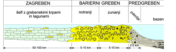 Recentna grebenska okolja lahko po značilnih združbah in po obliki grebenskih tvorb delimo na več vzporednih pasov: zunanji greben, notranji greben in zagreben. Podobno delitev opazujemo tudi v zgornjejurskem grebenskem kompleksu v Sloveniji. V zunanjem bariernem grebenu na samem robu platforme prevladujejo stromatoporoidi iz skupine aktinostromaridov in masivne koralne kolonije, ki so lahko kljubovale tudi najmočnejšim valovom. Vejnate korale so redke. Nasprotno pa je v notranjem bariernem grebenu vejnatih koral več, nežnejši parastromatoporidi nadomestijo odpornejše aktinostromaride. Za zatišni greben so značilni tanjši, med seboj ločeni kopasti grebeni, v katerih prevladujejo vejnati stromatoporidi.