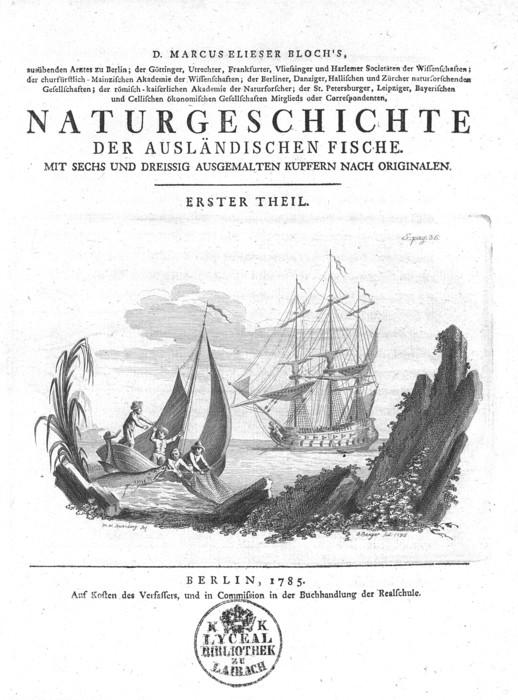Marcus Elieser Bloch (1723–1799) je bil berlinski zdravnik judovskega rodu, ki je vrsto let zbiral preparate rib. Na podlagi zbirke okrog 1400 primerkov z vsega sveta je pripravil obsežno publikacijo z naslovom Splošni prirodopis rib (Allgemeine Naturgeschichte der Fische), ki je izhajala v Berlinu od leta 1782 do 1795. Prvi trije od skupno 12 delov nosijo naslov Gospodarski prirodopis rib Nemčije (Oeconomische Naturgeschichte der Fische Deutschlands), drugih devet pa Prirodopis inozemskih rib (Naturgeschichte der ausländischen Fische). Besedilo je ilustrirano s skupno 432 barvanimi bakrorezi. Izdaji v nemščini je z nekajletnim zamikom sledila še francoska. Gre za najlepši in najpomembnejši publikaciji o sladkovodnih in morskih ribah 18. stoletja. Ko je Blochu med izdajanjem zmanjkalo denarja, je za finančno pomoč zaprosil nekatere premožne nemške osebe in ustanove. Mecenom, med katerimi je bil tudi baron Žiga Zois iz Ljubljane, se je oddolžil z navedbo njihovega imena na enem ali več bakrorezih. Zois je naveden na tabli 315 (CCCXV) samo z začetnicami naslova, imena in priimka: »Gestochen auf Kosten von B. S. Z. in Laibach« (Vrezano na stroške b[arona] S[igmunda] Z[oisa] v Ljubljani).