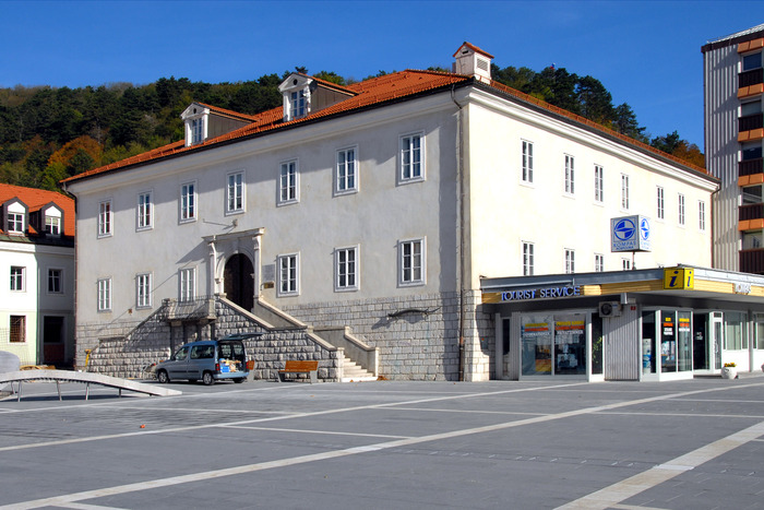 Ko je leta 1689 pogorel grad na Soviču, so na sedanjem Titovem trgu zgradili stavbo, imenovano Spodnja graščina. Od tedaj je bila nekajkrat prenovljena. Pomemben je poseg izpred 2. svetovne vojne, ko so odstranili vzpetino na jugovzhodni strani stavbe, poglobili zidovje na jugozahodnem in jugovzhodnem pročelju in zgradili zunanje stopnišče pred glavnim vhodom. Iz zapisa na strešni konstrukciji je razvidno, da je bila ta obnovljena leta 1929. Vzhodno krilo poslopja je bilo prenovljeno leta 1963, celotna stavba pa leta 1996. Dolga leta je bilo v stavbi sodišče, od leta 1951 sta bila v njej Notranjski muzej in Inštitut za raziskovanje krasa Znanstvoraziskovalnega centra SAZU, od zadnje prenove pa so v celotni stavbi prostori inštituta.