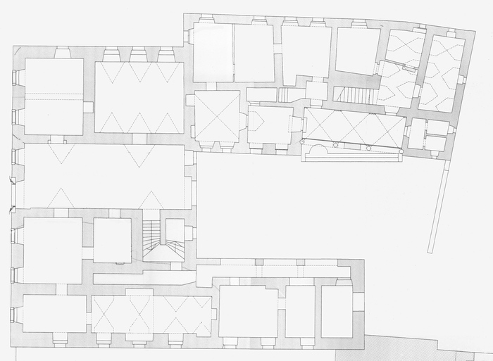 Nosilni zidovi stavbe so debeli od 50 do 120 cm, zidani iz kamna in apnene malte. Kamniti so tudi temelji in temeljni zidovi, ki so glede na zidove razširjeni. Ohranjeni so prvotni kamniti ali opečni oboki nad kletjo in pritličjem. Opečni oboki so precej globoki in imajo ob straneh, praviloma v območju vrat ali oken, t. i. vsečne čepice. Leseni stropovi nad 1. nadstropjem so bili ob zadnji prenovi močno prizadeti zaradi insektov in sive hišne gobe, zato jih je bilo potrebno nadomestiti z novimi stropnimi konstrukcijami.