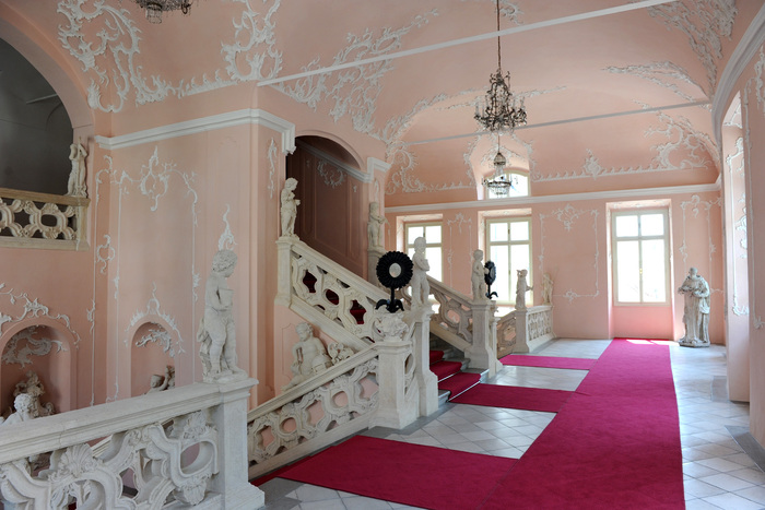 Najstarejše zahodno krilo je z baročnim stopniščem, kapelo in arkadnim hodnikom obrnjeno na Grajsko ulico. Baročno stopnišče, ki povezuje pritličje in nadstropje, je bogato s kipci in štukaturami. Nosilni zidovi in stebri so pretežno kamniti in deloma mešani. Stropne konstrukcije nad pritličjem in mezzaninom so opečni oboki, ki so bodisi eliptične bečvaste, bodisi križne oblike. Bečvasti oboki imajo v območju odprtin in stebrov vsečne čepice. Nekateri oboki imajo natezne vezi, ki so vidne v notranjosti (slika 5), njihova sidrišča pa na pročeljih (slika 6). Nekatera ostala sidrišča na pročeljih kažejo na prisotnost zidnih vezi. Nad viteško dvorano v nadstropju je dragocen zrcalno obokan baročni strop z leseno konstrukcijo in lesenim opažem. Nad ostalimi prostori v nadstropju so stropne konstrukcije polnotramovne lesene. Pri teh so stropniki na sredini razpetin obešeni na dodatne lesene nosilce, ti nosilci pa so podprti s prečnimi zidovi v nadstropju.