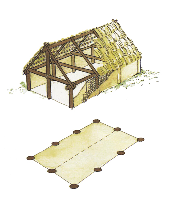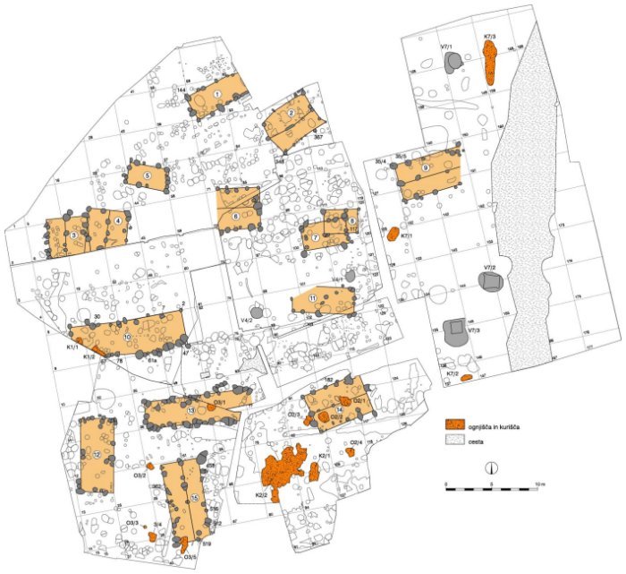 Z raziskavami so odkrili več odsekov, do 4 m širokih cest, ki so bile tlakovane z rečnimi oblicami. Ob njih so stale hiše. Po številnih jamah za kole sodeč, so bile grajene v tehniki stojkaste gradnje. Zanjo je namreč značilno, da so nosilci sten vkopani v podlago, med njimi je preplet iz protja, ometan z ilovico. Hiše so bile različno velike, v glavnem med 11 in 20 oz. 21 do 30 kvadratnih metrov. Pokrite so bile z dvokapnimi strehami. Običajno so imele le en prostor z ognjiščem, ki je bilo na sredini. Jame pod podi hiš so služile za shranjevanje živeža. Poleg glinenih posod so med hišni inventar sodili še svitkasti ognjiščni podstavki, pekve, vretenca in uteži za statve. Večina stavb je imela smer vzhod-zahod ali sever-jug. V istih smereh tečejo tudi ohranjeni odseki cest, po čemer lahko sklepamo na raster naselja. Med infrastrukturne objekte štejemo še vodnjake, ki so bili vkopani na dvoriščih.