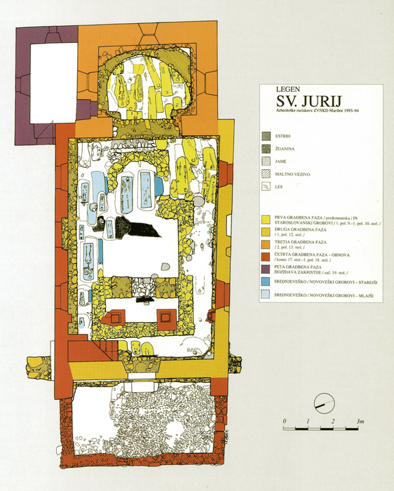 Leta 1993 so se odločili za menjavo tlaka v cerkvi sv. Jurija na Legnu. Po odstranitvi starega tlaka so naleteli na nejasne ruševinske ostanke, kar je vzpodbudilo arheološke raziskave, ki so dale presenetljive rezultate. Odkrili so pet starejših cerkvenih faz in za nameček še staroslovansko skeletno grobišče.