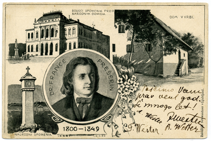 Ob koncu stoletja zasledimo Prešernovo podobo tudi na razglednicah. Leta 1897 je izšla razglednica natisnjena pri Th. Böhmu v Novem mĕstu na Moravskem. Wagnerjeva podoba Prešerna je v okvirju prepletenim z angelčkom in planikami. Razglednico krasi še Blejski otok in Prešernova rojstna hiša v Vrbi. Leta 1899 so izšle Prešernove umetniške razglednice, ki sta jih oblikovala Ivan Vavpotič in Matija Jama. Medtem ko Jamova razglednica poleg portreta ter rojstne hiše v Vrbi prikazuje tudi nagrobni spomenik v Kranju ter načrtovani Prešernov spomenik pred Narodnim domom v Ljubljani, se je Vavpotič posvetil tematiki Prešernovih poezij. Predloge za razglednice so prispevali tudi številni drugi umetniki (Saša Šantel-O Vrba, srečna draga vas domača, Maksim Gaspari-ilustracija Sonetnega venca, Ksenija Prunkova itd. ). Na razglednicah Vrbe najpogosteje zasledimo rojstno hišo, v kateri je danes muzej posvečen našemu največjemu poetu. Pomembna znamenitost vasi je tudi cerkev sv. Marka, ki ji je Prešeren posvetil par verzov v Sonetih nesreče. Leta 1899 je župan Ljubljane Ivan Hribar razpisal natečaj za načrt Prešernovega spomenika. Na natečaj je prispelo sedem načrtov. Prvo mesto na natečaju je zasedel Ivan Zajc, drugo Alojz Progar. Končna izvedba Zajčevega Prešernovega spomenika se nekoliko razlikuje od prvotno načrtovane. Danes lahko občudujemo pred skalo bronasto Prešernovo soho. Nad poetom sedi na skali muza z lovorjevo vejico, ki slavi Prešerna. V cerkvenih krogih je kip razgaljene muze povzročil neznansko ogorčenje. Škof Anton Bonaventura Jeglič je v pismu županu Ivan Hribarju izrazil zahtevo po takojšnji odstranitvi muze, kar pa se ni zgodilo. Ob straneh sta dodana reliefa z motiviko iz Prešernovih Poezij. »Relief na levi strani Prešernovega spomenika kaže prizor iz Prešernove pesmi Ribič; morske do pasu nage deklice vabijo mladega ribiča , ki vesla z vso silo dalje ter upira svoje oči v rešilno zvezdo na nebu. Relief na desni strani Prešernovega spomenika kaže prizor iz Krsta pri Savici : Bogomila plaka v objemu junaka Črtomira, na levi strani stoji žalostni Staroslav, sivolasi svečenik boginje Žive, na desni pa drži oproda iskrega konja, ki ponese Črtomira v boj z Valhunom.« Celotni spomenik meri v višino 9,6 metra. Prešernova soha je visoka 3,5 m. Najpomembnejša počastitev Prešerna je odkritje spomenika 10. septembra leta 1905 v Ljubljani na takratnem Marijinem trgu. Spomenik, ki je bil obdan z belimi zastori so odkrili po uvodnem govoru Ivana Tavčarja. Slovesnosti je prisostvovalo okoli dvajset tisoč ljudi.