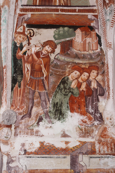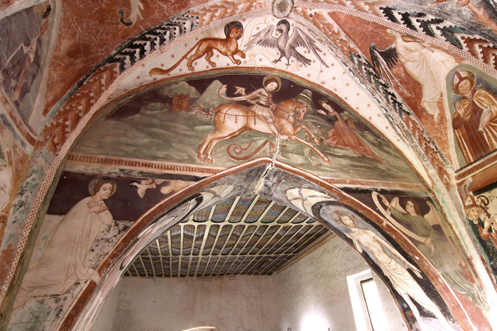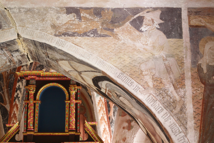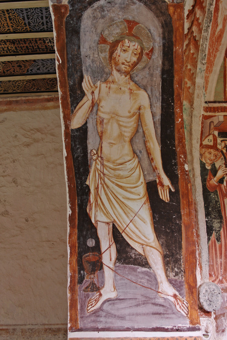 Votivna podoba s svetniki na severni strani zunanjščine (pročelju) je sicer danes uničena, na njej pa se je slikar še enkrat podpisal. Na vzhodni zunanjščini ladje sta se fragmentarno ohranili upodobitvi sv. Krištofa in Luksurije. Za sv. Krištofa so ljudje verovali, da pogled nanj prepreči nenadno smrt, zato so ga, tako kot v Visokem, običajno upodabljali v monumentalni velikosti na zunanjščini cerkva, da je bil viden tudi od daleč. Pri Luksuriji (Razvratnosti) gre za poučno moralizirajočo upodobitev. Freska je bila leta 1987 sneta, restavrirana in zamenjana s kopijo.
