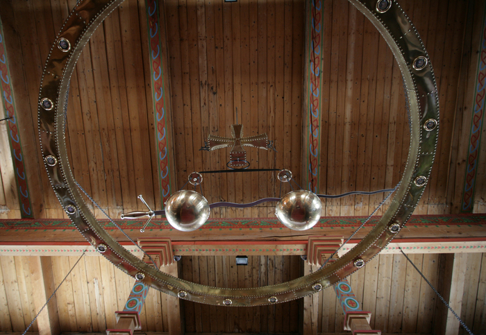 Notranjščina učinkuje toplo in domačno. Cerkvena ladja ima vzdolžno os krajšo od prečne. Povprek postavljena cerkvena dvorana naj bi skupnost vernikov bolj povezala z duhovnikom in je Plečnikov prispevek k posodobitvi liturgije. Predvsem pa je ureditev notranjščine posledica skromnih sredstev, namenjenih zidavi. Tako je za nekatere podporne stebre uporabil navadne kanalizacijske cevi. Večina opreme je lesena. Štiri osrednje stebre brez kapitelov dopolnjuje dekorativna lesena konstrukcija. Osrednji ograjeni hodnik vodi do nekoliko dvignjenega oltarja. Pred oltarjem je prostor, ograjen z leseno ograjo, klopi so razmeščene na vsaki strani, pevski kor je ob levi stranici. Ostrešje je odprto, pri čemer se je Plečnik odločil za živopisni, skoraj ljudski način poslikavanja lesa ter za poslikavanje notranjih betonskih stebrov z nekakšno poznosecesijsko dekoracijo. Leta 1940 so opremili še cerkveno notranjščino. Prostor nad oltarjem obvladuje velik lestenec: obroč, ki visi od križa z obešenima A in Ω (alfa in omega, prva in zadnja črka grškega alfabeta, ki se v krščanski umetnosti vedno nanašata na Kristusa). Lesene klopi v dveh delih prostora za ljudstvo so obdelane z zanimivimi »realističnimi« atributi. V petdesetih letih je Plečnik postavil pevski kor, ki spominja na kmečki gank: sloni na struženih stebrih z dodatnimi poševnimi oporami, nanj so speljane lesene stopnice.