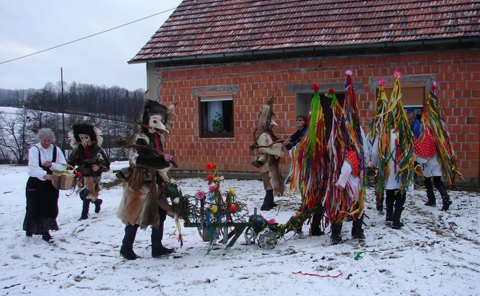 Na hišno dvorišče najprej priteče korant in z ruženjem oznani svoj prihod. Ko prideta gospodar ali gospodinja na hišni prag, korant zapleše in z ježevko zariše ris nad tlemi. Baba pristopi in vpraša gospodinjo ali gospodarja, če bodo dali orati. Ko pristanejo, pokač zapoka z bičem, kujeki pa zdirjajo v krogu in vlečejo za sabo plug, ki ga drži za ročaj plužar ali eden od korantov. Baba poskakuje z njimi v krogu in seje pleve iz sejače. Po končanem oranju baba pristopi h gospodinji in sprejme plačilo: denar ali jajca in klobaso. Pristopijo tudi koranti, ki prosijo za denar, in pokač, ki prosi denar za bičeve repke. Sledi pogostitev s pijačo in pustnimi jedmi (vino, kruh, šunka, krofi).