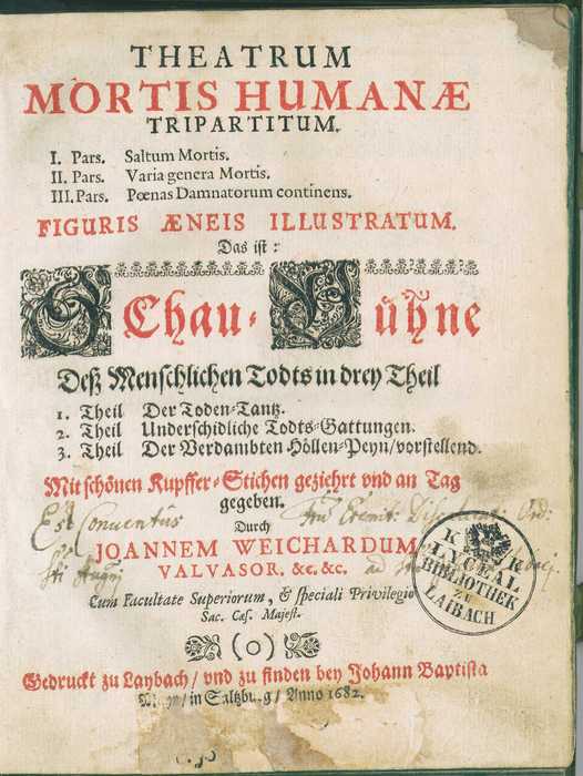 Valvasorjev Theatrum mortis humanae tripartitum je verzificirano moralno-didaktično delo, s katerim avtor opominja na minljivost človeka in na potrebo po krepostnem življenju, ki vodi v zveličanje, obenem pa v njem predstavi celo vrsto različnih oblik smrti in peklenskih muk. V vsebinskem pogledu gre za variacijo uveljavljene moralistične teme smrti, ki je zanimiva zlasti z vidika razvoja mrtvaške ikonografije v evropski literaturi in likovni umetnosti 17. stoletja. Valvasor moralistični tradiciji dodaja izvirno enciklopedično noto, značilno za njegov polihistorski pristop. Knjiga ima 256 strani, izdaja je dvojezična - verzi so zapisani v latinščini in nemščini -, krasi pa jo 121 bakrorezov, ki jih je v Valvasorjevi grafični delavnici na Bogenšperku vrezal graški mojster Andrej Trost (1643-1708). Grafike v prvem delu knjige so povzete po lesorezih Hansa Holbeina mlajšega (ok. 1497-1543), za drugi in tretji del pa je izvirne ilustracije prispeval slovenski slikar Janez (Ivan) Koch (ok. 1650-1715). Bakrorezi so ikonografsko zanimivi in v tehničnem pogledu kvalitetno izvedeni. Posebno privlačen je celostranski uvodni bakrorez Zmagoslavje smrti, saj ga je zasnoval sam Valvasor.