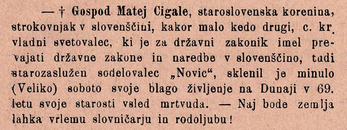 - M.(arn), J. 1889: Matej Cigale. Slovenec 92. Ljubljana.