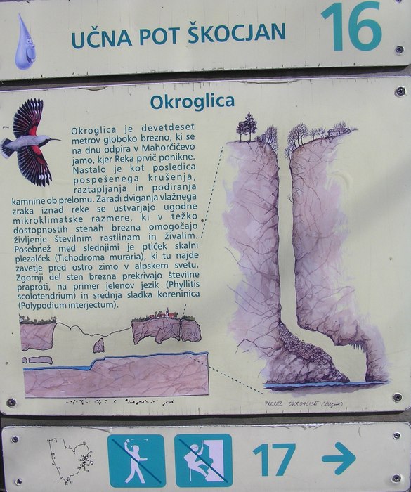Na južnem robu vasi Škocjan se ob cesti, ki pripelje iz Matavuna, odpira okrogel vhod v brezno Okroglica. 76 m globoko brezno s premerom 40 m se konča s podornim stožcem nad levim bregom Reke v Mahorčičevi jami. S podornega stožca se prevesita v samo podzemsko sotesko Reke dva prehoda. Brezno je ograjeno s slikovito kamnito ograjo iz začetka stoletja.