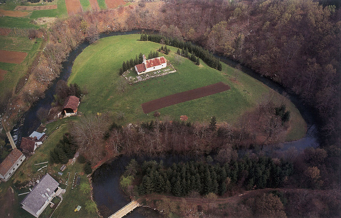Lahinja naredi pri Pustem Gradcu skoraj krožni okljuk. Teren znotraj okljuka se od obal proti notranjosti postopoma dviguje. Na najvišji točki stoji podružnična cerkev Vseh svetnikov s pokopališčem. Pri obdelovanju zemlje in izkopu jam za grobove so naleteli na številne arheološke predmete, ki pričajo, da je bil naravno zavarovan polotok obljuden v različnih obdobjih. Vhod v naselje lahko pričakujemo na mestu, kjer se pentlja Lahinje skoraj združi.