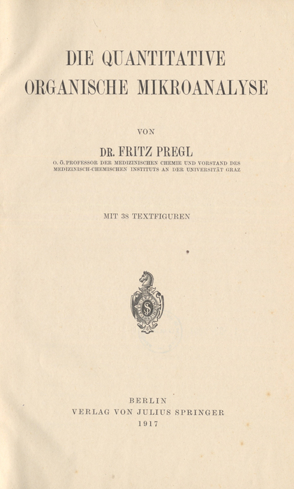 Knjiga Fritza Pregla Die quantitative organische Mikroanalyse (Kvantitativna organska mikroanaliza) je izšla leta 1917 v Berlinu. Na začetku navaja avtor svoja dognanja, vezana na precizno analitsko tehtnico, ki jo je skonstruiral skupaj s podjetjem Kuhlmann iz Hamburga. Z omenjeno tehtnico ter drugimi aparaturami je dosegel, da so raziskovalci za analize potrebovali 10-100 krat manjšo količino določene snovi. Za natančne rezultate je določil tudi pogoje za uporabo tehtnice, ki so vezani na postavitev, klimo, gibanje v prostoru itd. V nadaljevanju se ukvarja z določitvijo ogljika in vodika v najmanjših količinah organskih snovi, s plinskovolumetrično določitvijo dušika v majhnih količinah organskih snovi (Mikro-Dumas), določitvijo dušika po Kjeldahlu v majhnih substančnih količinah (Mikro-Kjeldahl), mikroanalitično določitvijo halogenov, žvepla, fosforja, karboksila, metoksilnih in etosilnih kislin, metilnih skupin na dušiku, določitvijo molekularne teže v majhnih količinah organskih snovi po načelu zviševanja vrelišča itd. Dognanja našega edinega Nobelovega nagrajenca so bila še posebej pomembna za raziskovanje molekulske mase, elementne sestave in strukturne formule organskih spojin, ki so na voljo v majhnih količinah kot npr. encimi, hormoni, vitamini, žolčne kisline, saj se je vse do Pregla raziskovanje na tem področju zaustavilo. Pregl je omogočil hitrejše analize ter s tem nova odkritja na številnih naravoslovnih področjih. Knjiga je bila zaradi pomembnosti za nadaljnji razvoj naravoslovnih ved večkrat ponatisnjena ter prevedena v angleščino in francoščino.