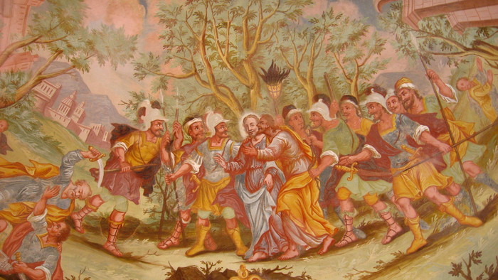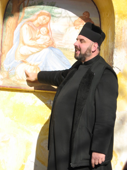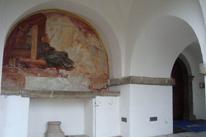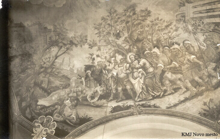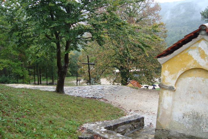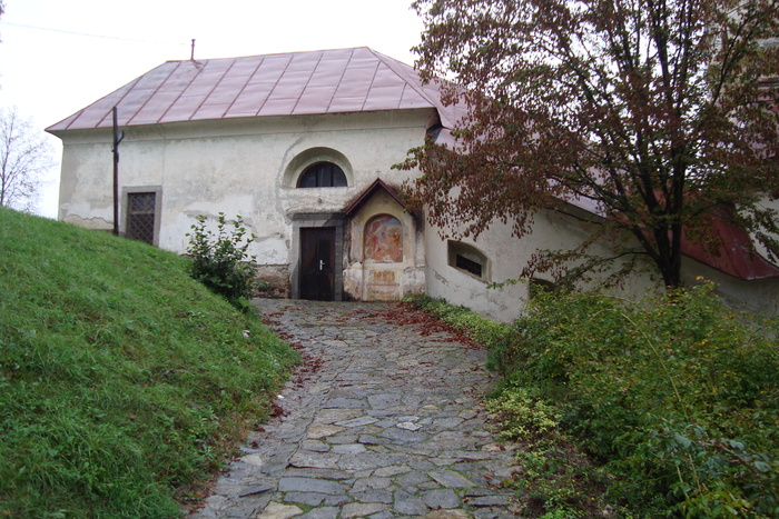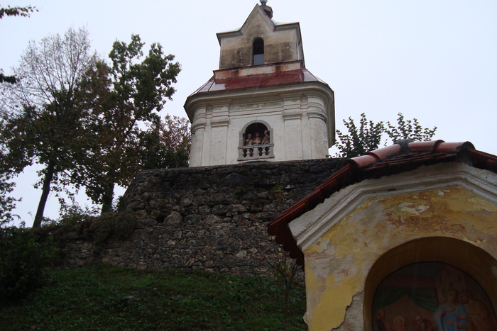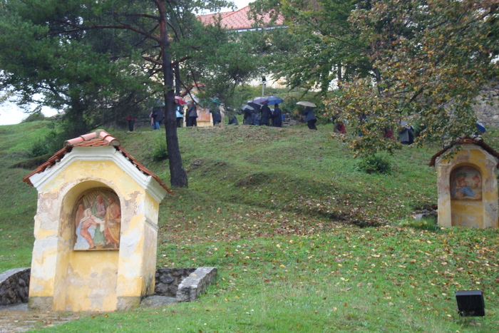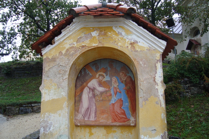V podnožju griča je kapelica s podobo Marije z Jezusom (pietà), od tam pa se po vzhodni strani griča vije romarska pot s kapelicami, ki prikazujejo sedem žalosti Matere Božje: Simeonovo prerokbo, Beg v Egipt, Marijo, ki išče dvanajstletnega Jezusa, Marijo, ki sreča Jezusa na križevem potu, Žalostno Mati božjo pod križem, Snemanje s križa in Polaganje v grob, pri čemer sta dve upodobitvi že na južni steni Svetih stopnic. Avtor poslikav je Matija Koželj. Ker so v kasnejšem obdobju freske zbledele, so jih večkrat obnovili, med obnovitelji pa sta bila Matija Bradašek in akademski slikar Mole.