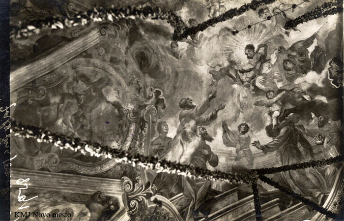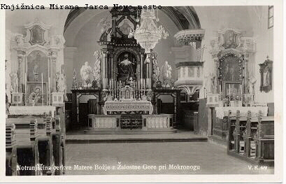 Na vrhu griča je romarska cerkev Žalostne Matere Božje, ki je najstarejša izmed objektov. Izvira iz pozne renesanse, ko je bila dokončana ladja, ter zgodnjega baroka, ko je bil dograjen prezbiterij. Smer slemena objekta je zahod-vzhod. Na zahodni strani se priključuje visok zvonik z vogelnimi stolpiči. Zahodneje se nahaja oltar sv. Peregrina. Preprosto zunanjščino cerkve dopolnjuje bogato okrašena notranjost. Ladja s prizorom Križevega pota je iz začetka 20. stoletja. Cerkvene stene so bogato okrašene z raznovrstnimi votivnimi podobami, ki so bile ustvarjene konec 17. in na začetku 19. stoletja. Razkošna je tudi poslikava prezbiterija, ki je delo baročnega slikarja Franca Jelovška. Na plitvem oboku je upodobil Mater Božjo s sedmimi ustanovitelji servitskega reda – to je skupino redovnikov, ki jih danes na Slovenskem ni več, nekoč pa so se posvečali Marijinem čaščenju. Nosili so črnosivo obleko in črno vrhnje oblačilo (škapulir). Prvotno je cerkev imela štiri oltarje, danes ima tri. Veliki oltar je po naročilu mokronoškega graščaka Kajzerja iz črnega marmorja izdelal mojster Mihael Cussa. V osrednjem stebriščnem delu je v niši podoba Žalostne Matere Božje z mrtvim Jezusom v naročju. Ob straneh sta kipa apostolov sv. Petra in sv. Pavla. Dva stranska oltarja imata oltarni sliki Valentina Metzingerja. Levi ima v osrednji niši oljno sliko Mučenje sv. Jerneja, desni pa sliko sv. Jožefa z Jezuščkom v naročju.