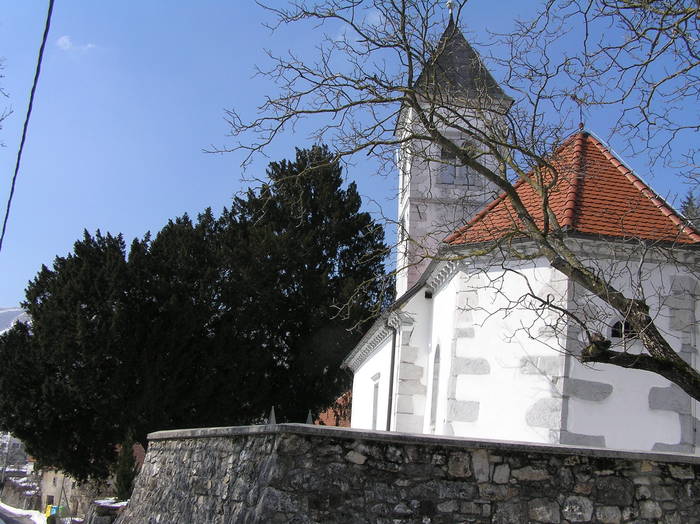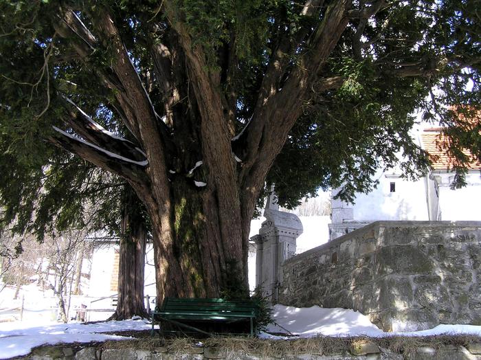 Mogočni tisi rasteta pred cerkvijo sv. Križa v Stranah.