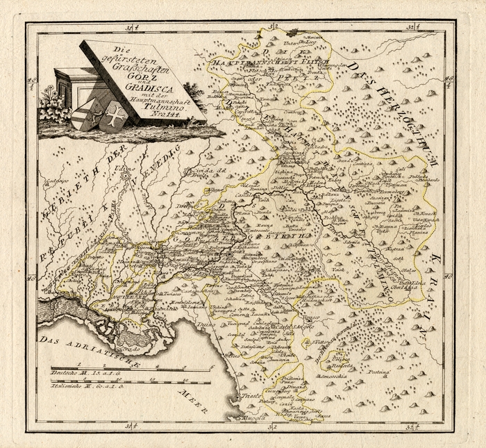 Zemljevid Die gefürsteten Grafschaften Görz und Gradisca mit der Hauptmannschaft Tulmino Nro. 144 je vzet iz atlasa Schauplatz der fünf Theile der Welt nach und zu Anton Friedrich Büschings grosse Erdbeschreibung indrey Theilen, ki je izšel na Dunaju med letoma 1789 in 1806 (1809). Zemljevid natančno prikazuje pokneženo grofijo Goriško in Gradiško, vključno z glavarstvom Tolmin. Franz Johann Joseph von Reilly (1766–1820) je bil plodovit avstrijski kartograf, ki je izdeloval za tisti čas izjemno natančne zemljevide. V kratkem obdobju jih je izdal več kot tisoč. Relief na obravnavanem zemljevidu je nakazan s hribčki. Mreža naselij je gosta.