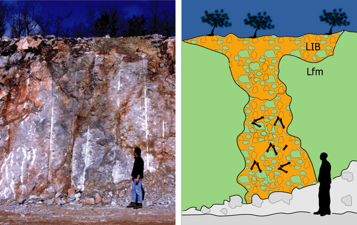 Najdišče fosilnih vretenčarjev pri Kozini je nastalo ob koncu krede. Fragmenti vretenčarskih kosti so razpršeni v breči, ki zapolnjuje nekdanje kraško brezno. Položaj in oblika fosilov pričata o tem, da so bile kosti najdene na drugotni lokaciji – v fosilnem kraškem breznu (slika1), kamor jih je z neke druge prvotne lokacije prestavil plaz, močno neurje ali podoben dogodek. Najmanjši fosilni skeletni ostanki merijo manj kot milimeter, največji pa presegajo 20 cm, večinoma so črne barve in zdrobljeni do nerazpoznavnosti (slika 2).