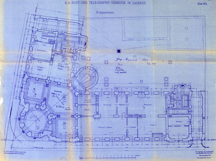 Dvonadstropno poslopje glavne pošte so začeli graditi kmalu po ljubljanskem potresu leta 1895, po načrtu, ki ga je v letih 1894-96 na Dunaju izdelal Friderich Setz. Končano je bilo 1. novembra 1896. Na pročeljih poslopja so vgrajeni medaljoni s poštnimmi emblemi (poštni rog, strelovodne puščice) ter avstrijski, kranjski in mestni grb. V poslopju so leta 1897 namestili telefonsko centralo, ki je imela zvezo z Gradcem, Dunajem in Trstom. Ta centrala je štela v začetku 89, leta 1918 pa že 400 naročnikov.