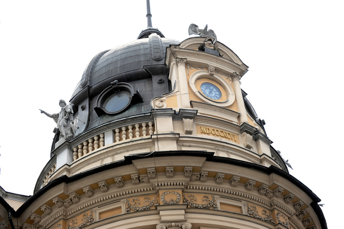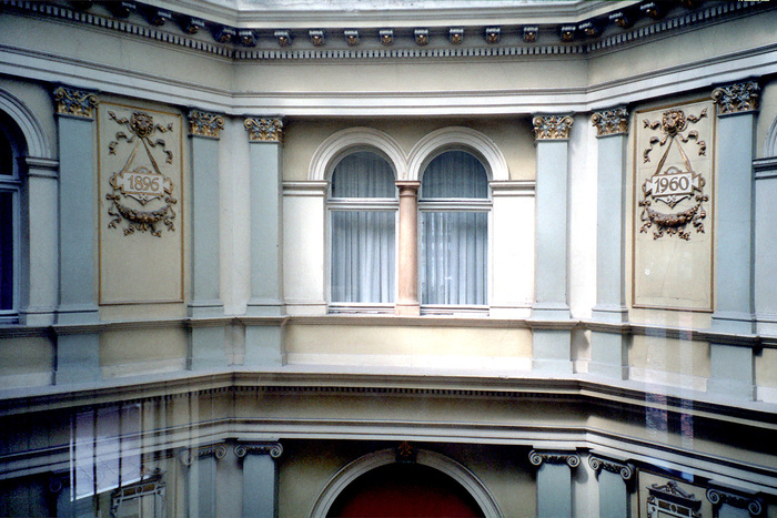 Centralni vhodni del na križišču Slovenske ceste in Čopove ulice je okroglega tlorisa in ga zaključuje kupola. V diagonalni smeri proti notranjemu dvorišču mu sledi atrij, v katerem je polkrožno stopnišče, pokrito z dvojno stekleno streho. Od centralnega dela se vzdolž obeh ulic širita dva kraka. Oba imata poleg kleti in pritličja še dve nadstropji in podstrešje, pokrivata pa ga dvokapni strehi. Nosilno konstrukcijo sestavljajo opečni zidovi različnh debelin. Stropne konstrukcije nad kletjo in pritličjem so opečni oboki, nad nadstropjema pa so še večinoma prvotni leseni stropovi. Izjema je armirano-betonska stropna konstrukcija nad 1. nadstropjem v traktu ob Slovenski cesti, s katero so leta 1925 zamenjali prvotne lesene stropove.
