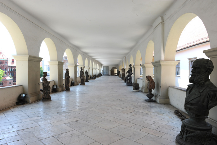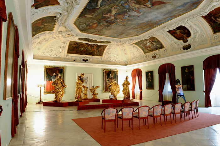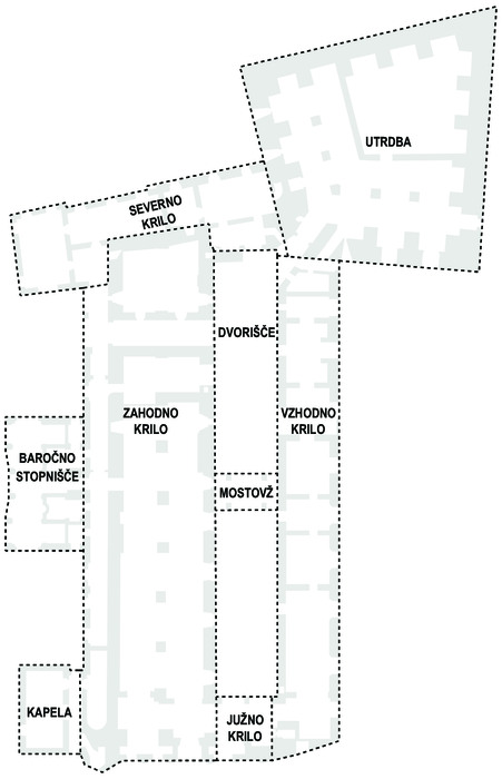 Najstarejše zahodno krilo je z baročnim stopniščem, kapelo in arkadnim hodnikom obrnjeno na Grajsko ulico. Baročno stopnišče, ki povezuje pritličje in nadstropje, je bogato s kipci in štukaturami. Nosilni zidovi in stebri so pretežno kamniti in deloma mešani. Stropne konstrukcije nad pritličjem in mezzaninom so opečni oboki, ki so bodisi eliptične bečvaste, bodisi križne oblike. Bečvasti oboki imajo v območju odprtin in stebrov vsečne čepice. Nekateri oboki imajo natezne vezi, ki so vidne v notranjosti (slika 5), njihova sidrišča pa na pročeljih (slika 6). Nekatera ostala sidrišča na pročeljih kažejo na prisotnost zidnih vezi. Nad viteško dvorano v nadstropju je dragocen zrcalno obokan baročni strop z leseno konstrukcijo in lesenim opažem. Nad ostalimi prostori v nadstropju so stropne konstrukcije polnotramovne lesene. Pri teh so stropniki na sredini razpetin obešeni na dodatne lesene nosilce, ti nosilci pa so podprti s prečnimi zidovi v nadstropju.
