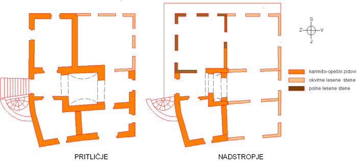 Nosilno konstrukcijo sestavljajo masivni zidovi, lesene stene, leseni stropovi in leseno ostrešje preko hiše, ganka in zunanjega stopnišča. Masivni zidovi, ki so zidani mešano iz kamna in kosov opeke v apneni malti, so v kleti, pretežnem delu pritličja in manjšem delu nadstropja (slika 2). Lesene stene so v severozahodnem delu nadstropja polne - izvedene iz brun, na preostalem delu nadstropja in pritličja pa kot leseni okviri in polnilom iz desk (slika 6).