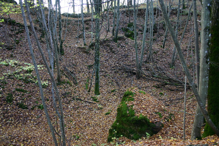 6 do 7 m globoka udorna vrtača ima premer okrog 25 m. Nastala je tako, da se je zaradi raztapljanja apnenca površje znižalo. Ko se je strop nekdanje jame razkrojil, se je jama odprla proti površju (brezstropa jama). Na njenih robovih so sledovi sige, ki skupaj s kapnikom in flišnimi sedimenti dokazujejo, da gre za ostanek vodoravnega kapniškega rova, ki mu je v geološki zgodovini denudacija odstranila strop. Brezstropi (denudirani) jami, ki jo je raziskal dr. Andrej Mihevc, lahko od kapnika sledimo proti vzhodu vse do 1800 m oddaljenega dola Lisičina.