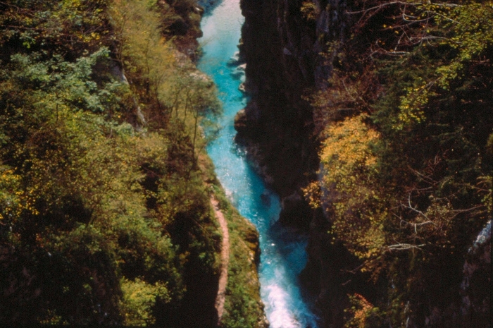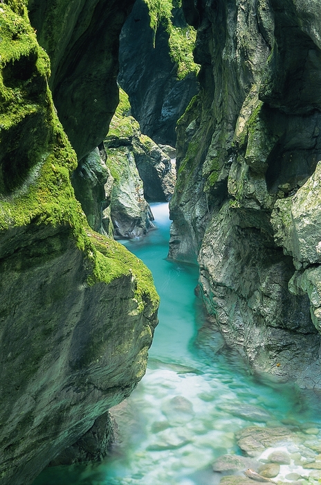 Na najnižji točki Triglavskega narodnega parka, približno 180 metrov nad morsko gladino, je reka Tolminka izoblikovala globoka korita z značilnimi prelomi, ki jih vidimo kot gladke navpične ploskve. Voda je v pregradi triasnega apnenca našla razpoko ali prelom in si z vrezovanjem vanj utrla tesno pot v dolino. Vzhodneje si je korita z globinsko erozijo izdolbla tudi reka Zadlaščica. Reki se združita v koritih, kar je še posebej zanimivo, saj je to edino sotočje v koritih na ozemlju Slovenije. Ob koncu vklesane poti po koritih Tolminke se odpre pogled na najožji in najglobji del korit ter na vhod v jamo, ki je zanimiva zaradi izvira termalne vode. Temperatura izvira je okrog 21° C. Ob pronicanju površinske vode skozi apnenec v globino se voda zaradi geotermične energije segreje in se po razpokah ali prelomih dvigne nazaj na površino. V Tolminki in pritoku Zadlaščici se je ohranila soška postrv Salmo trutta marmoratus, endemna vrsta jadranskega porečja, z značilnim marmornim vzorcem, na katerem so v redkih primerih tudi rdeče pike.