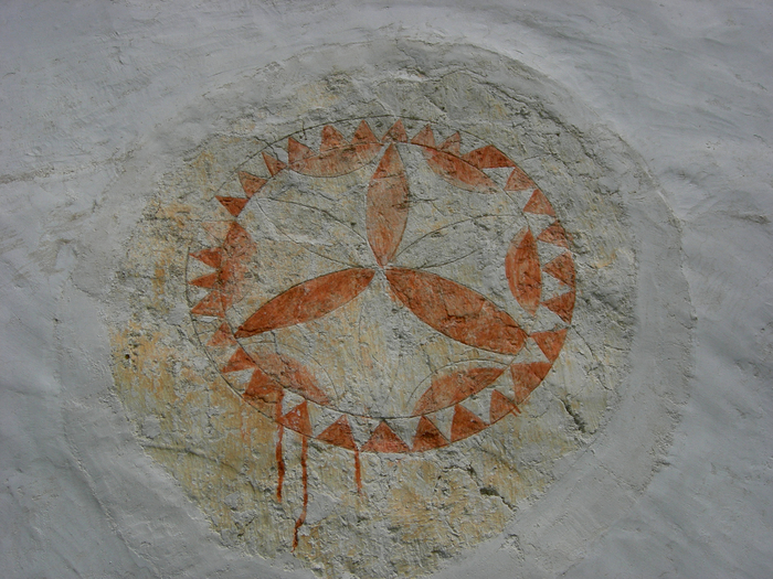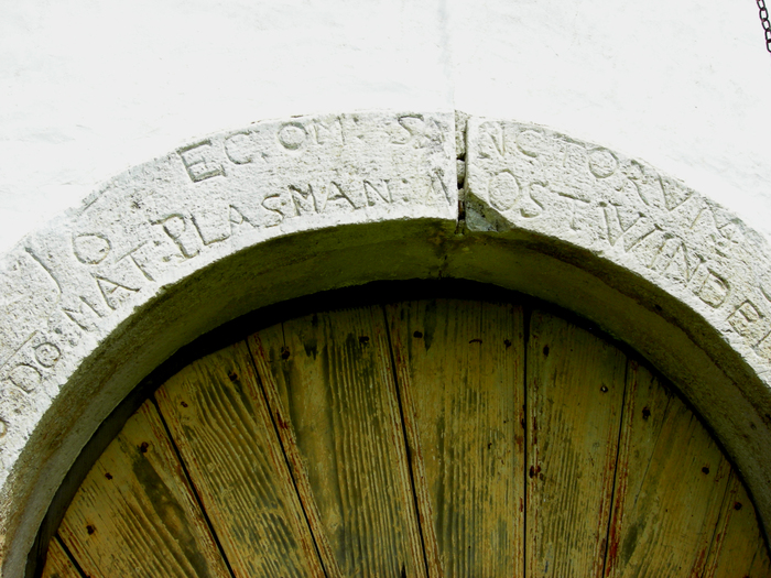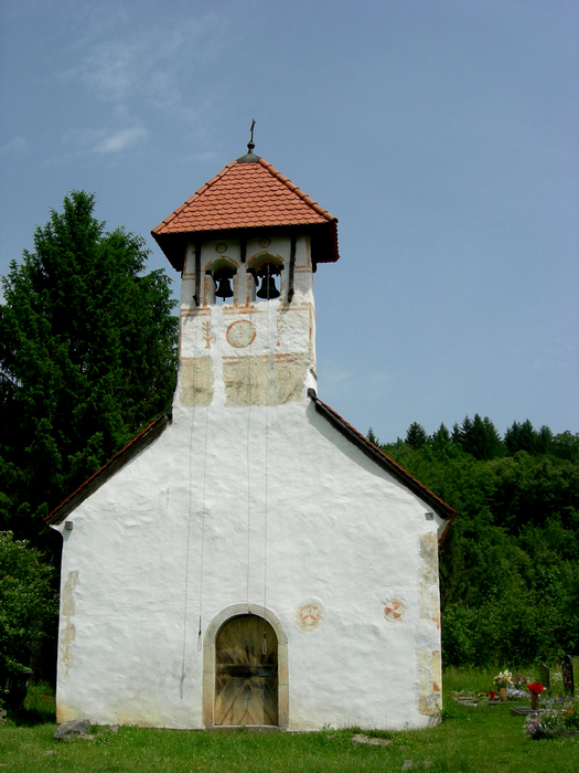 Cerkev Vseh svetnikov stoji sredi pokopališča v osrednjem delu okljuka, ki ga je izdolbla reka Lahinja. V kamniti portal vklesan latinski napis razkriva, da je cerkvico leta 1638 dal pozidati plemeniti gospod Matija Plasman. Neznani izvajalec, ki je delo opravil, je na severni steni prezbiterija pustil svojevrsten pečat, s tem ko je vanjo vtisnil svojo dlan, saj menda ni znal pisati.