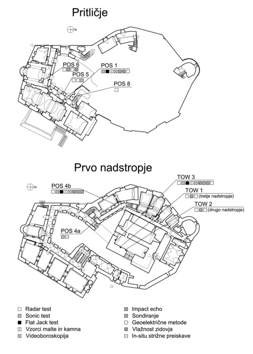 Zidovje je bilo preizkušano z več tehnikami: z radarjem, zvočnimi testi (sonic test), ki meri hitrost zvoka v zidu, testi s ploščatimi bati (flat-jack), in-situ strižnimi preiskavami in videoboroskopijo. Odvzetih je bilo več vzorcev kamna in malte, ki se jih je preizkusilo v laboratoriju in določilo njihovo sestavo.
