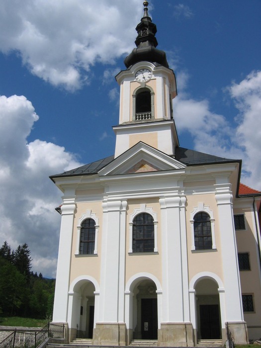 Visokobaročni nekdanji samostan dominikank s cerkvijo leži ob severnem robu naselja Adergas na Gorenjskem. Leta 1238 ustanovljeni in v turškem napadu 1471 zelo poškodovan samostan so začeli postavljati na novo leta 1732 pod vodstvom ljubljanskega stavbenika Gregorja Mačka, do njegove smrti je bil dokončan le vzhodni del, cerkev so začeli graditi leta 1766 po načrtu tržaškega arhitekta Candida Zullianija, zahodni del samostana so nameravali postaviti po dograditvi cerkve, vendar se to ni zgodilo. Cerkev naj bi torej stala med preprosto členjenima samostanskima kriloma in poudarjala osrednjo os kompleksa. Cerkveno pročelje z vključenim zvonikom, členjeno s štirimi kolosalnimi pilastri in v sredini zaključeno s trikotnim čelom, se v oblikovanju naslanja na ljubljansko križevniško cerkev oziroma na ljubljanski rotovž; kot vzor za oblikovanje notranjščine, dvorane s stranskima kapelama in kvadratnim prezbiterijem, členjene s kolosalnimi pilastri in palladijanskim motivom, pa je služila ljubljanska uršulinska cerkev. Pomembna je tudi skupina oltarnih podob, ki jih je v letih 1773-75 izdelal avstrijski slikar Johann Martin Kremser-Schmidt.