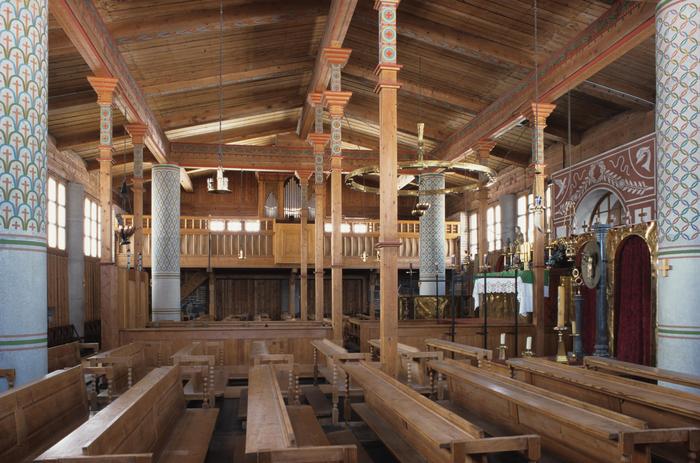 Notranjščina učinkuje toplo in domačno. Cerkvena ladja ima vzdolžno os krajšo od prečne. Povprek postavljena cerkvena dvorana naj bi skupnost vernikov bolj povezala z duhovnikom in je Plečnikov prispevek k posodobitvi liturgije. Predvsem pa je ureditev notranjščine posledica skromnih sredstev, namenjenih zidavi. Tako je za nekatere podporne stebre uporabil navadne kanalizacijske cevi. Večina opreme je lesena. Štiri osrednje stebre brez kapitelov dopolnjuje dekorativna lesena konstrukcija. Osrednji ograjeni hodnik vodi do nekoliko dvignjenega oltarja. Pred oltarjem je prostor, ograjen z leseno ograjo, klopi so razmeščene na vsaki strani, pevski kor je ob levi stranici. Ostrešje je odprto, pri čemer se je Plečnik odločil za živopisni, skoraj ljudski način poslikavanja lesa ter za poslikavanje notranjih betonskih stebrov z nekakšno poznosecesijsko dekoracijo. Leta 1940 so opremili še cerkveno notranjščino. Prostor nad oltarjem obvladuje velik lestenec: obroč, ki visi od križa z obešenima A in Ω (alfa in omega, prva in zadnja črka grškega alfabeta, ki se v krščanski umetnosti vedno nanašata na Kristusa). Lesene klopi v dveh delih prostora za ljudstvo so obdelane z zanimivimi »realističnimi« atributi. V petdesetih letih je Plečnik postavil pevski kor, ki spominja na kmečki gank: sloni na struženih stebrih z dodatnimi poševnimi oporami, nanj so speljane lesene stopnice.